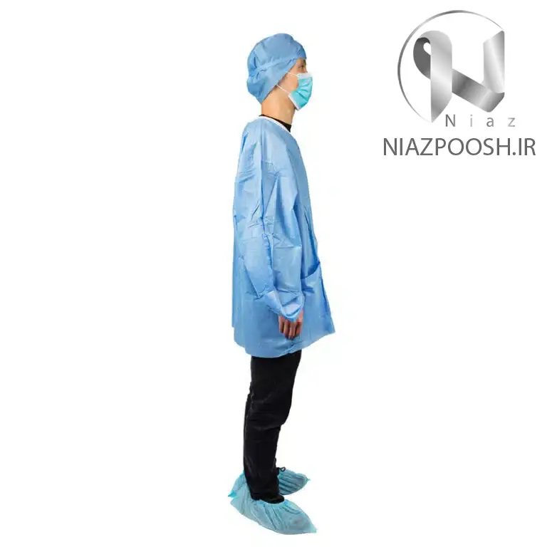 روپوش اسپان باند سفید با یقه چرخشی از اس ام اس (اسپان باند+ملت بلون+ اسپان باند) یا مواد پلی پروپیلن 100% تابیده شده نبافته تولید شده تا بتواند به عنوان پوششی حفاظتی مورد استفاده قرار گیرد.